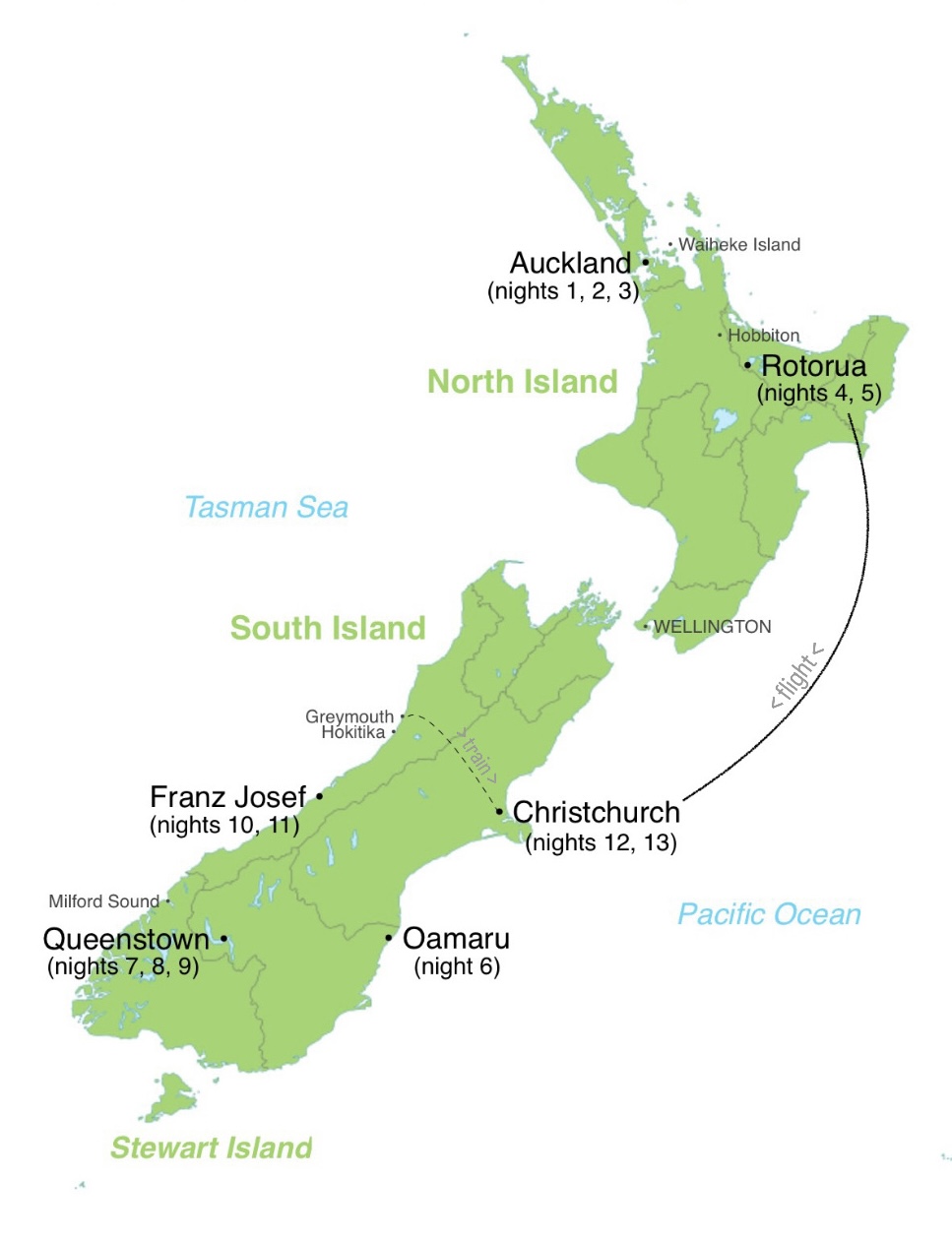 13 nights accommodation in Auckland (3 nights), Rotorua (2 nights), Oamaru (1 night), Queenstown (3 nights), Franz Josef (2 nights), Christchurch (2 nights)